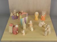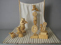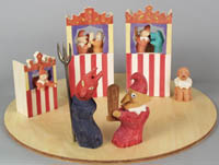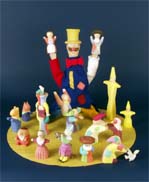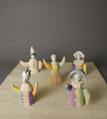 | 人形劇団ひとみ座を経て73年以降フリー。 KOBATAKE工房で彫刻を学び二科展出品。90年以降、瀬戸の美夜之窯で陶芸をはじめる。 現在 フリーの美術家として、舞台・人形美術の他、イラストレイション、壁面デザイン等の仕事も手がけている。 工房アルレッキーノ主宰。1949年生まれ。 ※人形美術などを担当した最近の主な舞台作品。 2002年 演劇公演「草迷宮−泉鏡花の魔界に遊ぶ」人形美術 (今和朗作、今井耕二演出) 2003年 人形劇公演「鳥に聞かされた話」人形美術 (遠藤啄郎作・演出/ひとみ座) 2004年 パペレッタ「まざあぐうすの唄芝居」美術・人形美術(久田惠作・演出) 2005年 人形劇公演「だいじょうぶ・だいじょうぶ?」美術・人形美術(石川哲司演出/デフパペットシアターひとみ) 2006年 人形劇公演「はこ/BOXES」美術・人形美術 2007年 陶壁「子どもたちの樹」(八王子共励保育園) 個展「太田拓美 陶人形展」ギャラリー五峯 産経新聞毎週金曜日の久田恵さんのコラムにイラスト掲載中 |