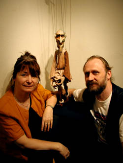 | 人形デザイン、衣装、彩色を担当するMichaela Bartonova(1955年生まれ)。 彫りと人形の構造を担当するAntonin Muller(1953年生まれ)。 ともに、現代のチェコを代表する劇人形作家。 89年に独立して以降、二人のコンビが生み出す劇人形作品は、 その卓越した造形力、彫りと布使いの絶妙なバランス感覚によって、 つねに高い評価を獲得してきた。 自らが主催する"TINEOLA THEATER"のほか、ベルギーの "THEATER TAPTOE"、 ドイツの"THEATER KOBALT"、"SALZ UND PFEFFER"など、 国外の劇団のための人形美術制作も多い。 ドイツ、スウェーデン、デンマーク、イギリスなど、ヨーロッパ各国での公演、個展、 ワークショップ活動も精力的に行っている。 2003年、北九州市門司港のアミューズメントミュージアム”海峡ドラマシップ”のために、 川本喜八郎氏や友永詔三氏など 著名な日本人人形作家8名と並んで常設展示の作品を制作。 |