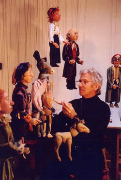 1939年、ドイツ北東部のPlauen(旧東ドイツ)に生まれる。 Dresdenおよび Frankfurtの美術学校で彫刻を学ぶ。 1970〜72年、アルブレヒト・ローゼル(ドイツを代表するマリオネティスト)とともに、 西ドイツ放送局(WDR)で放映された"Robbi, Tobbi und das Fliewatuut"のための 人形制作および操演を担当。 その他、グリム兄弟が育った街として有名なSteinauの マガズッペ・マリオネット劇場をはじめ、 スイスのチューリッヒ人形劇場、ドルナッハ・マリオネット劇団など、 数々の劇団から人形・舞台美術制作の依頼を受ける。 ドイツを代表するマリオネット作家のひとりであると同時に、長年にわたり、 南ドイツのシュタイナー学校にて美術教師、絵画セラピストを務める。 衣裳は、Jochen氏のパートナーであり、 シュタイナーの動きの芸術オイリュトミーの実践者として知られる、 Harumi Suzuki Grundmannさんの手による。 |