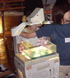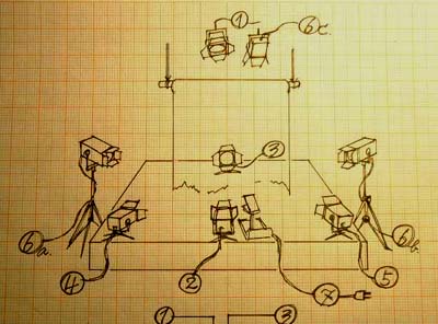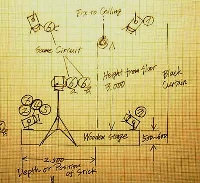 | TECHNICAL REQUEST -FAIRYTALES (POHADKY)- A) The minimum size of stage is 450cm(width) ~ 350cm(depth) ~ 50-60cm(height). B) The whole stage should be dark. C) 5 hours are necessary for setting the decorations, checking the lights, sound, and rehearsal. I need 1 lighting-technician and 1 sound-technician from your staff. If he has experiences about all techniques, it's possible by the same person. D) Please prepare lights and sound equipments by your side (cf. attached stage plan). About the lighting, I need 8 lights of 500w with the convex lens (Spot) and wings, 6 circuits in console, 2 high stands about 2m and 4 low stands for floor lights. About the color filter, I need one orange for No.4 and one blue for No.5. 1 direct electric AC line for OHP (Over Head Projector). About the sound, a mini-disk player, an amplifier and 2 speakers. Please set the speakers on the left and the right backside of the stage. E) Please prepare OHP (Over Head Projector, they often use it in the school. cf. attached photo) as bright type as possible. F) Please prepare a wooden or metal stick (250-300cm) to hang from the ceiling. I will put the paper-roll on it. The weight of paper-roll is just a few kg. G) Please clean up the stage before and after setting the decorations. After setting, don't walk on the stage with shoes, because the performance is played by Japanese style with barefoot. If you have any difficulty, please contact me. The plan could be flexible but I should know it in advance. Thank you very much for your cooperation ! |